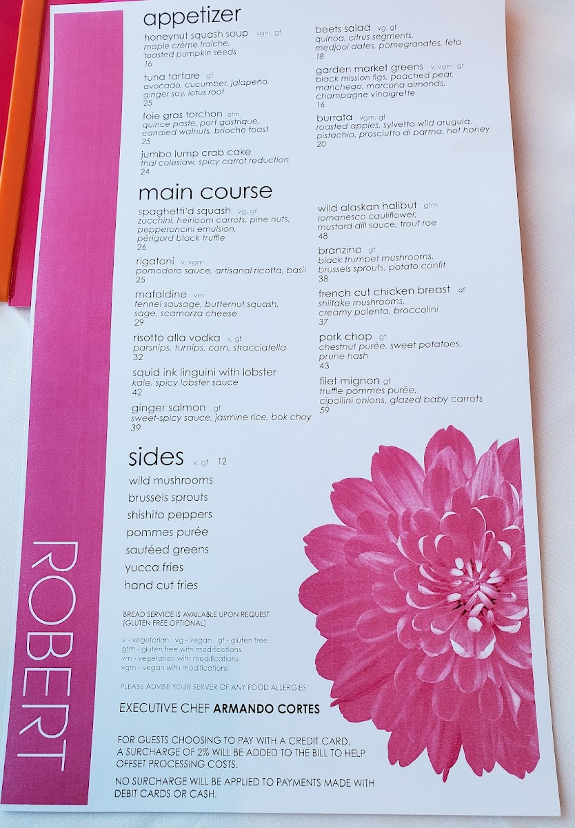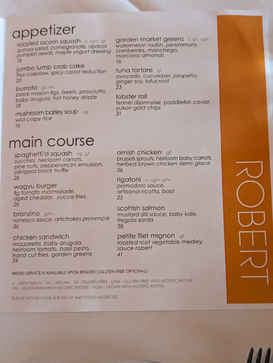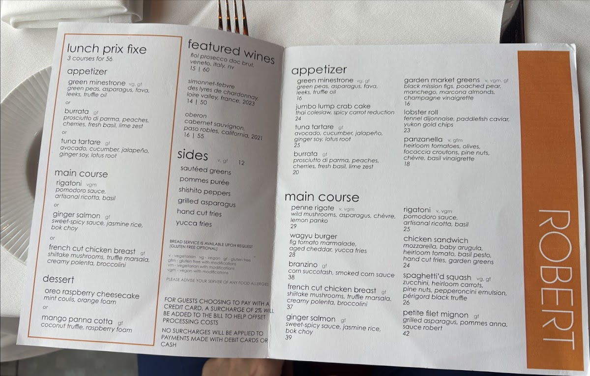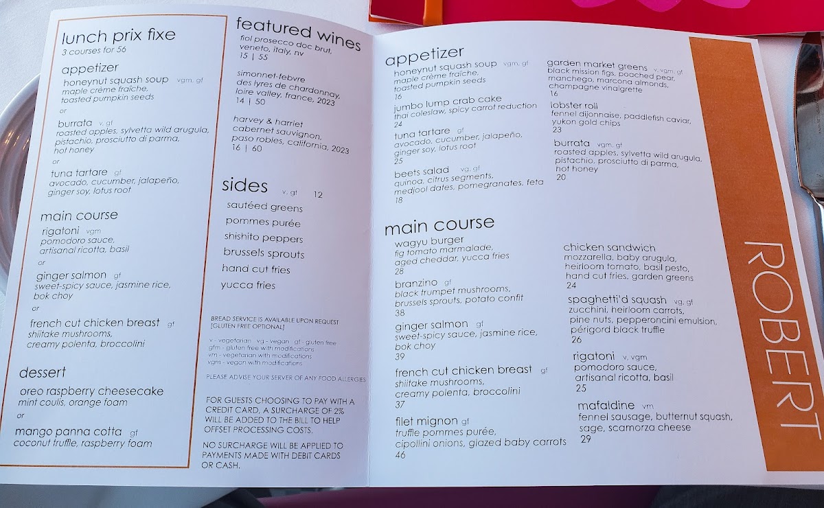 The menu at ROBERT offers a refined yet approachable take on American dining, blending carefully crafted dishes with thoughtful seasonal ingredients. It leans toward elevated comfort food and contemporary flavors, perfect for a leisurely lunch, a relaxed dinner, or a special occasion. Whether you’re starting with a delicate tuna tartare or savoring a warm bowl of honeynut squash soup, the selections invite enjoyment alongside the restaurant’s serene and stylish atmosphere.